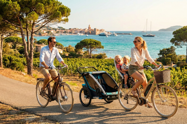 Forfait Famille Électrique contient 2 vélos électrique de type VTC, ainsi qu'une remorque double pouvant accueillir deux enfants. Le tout sur une durée d'une semaine.