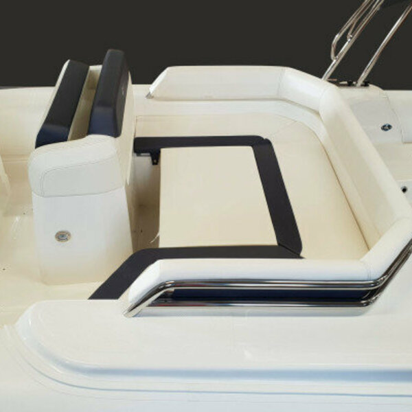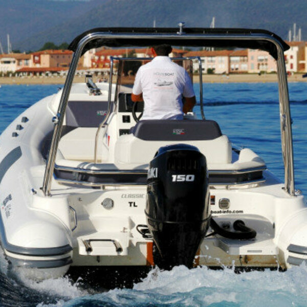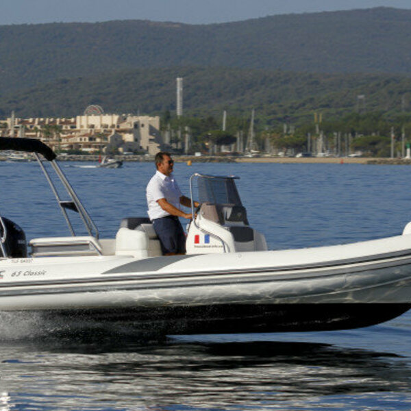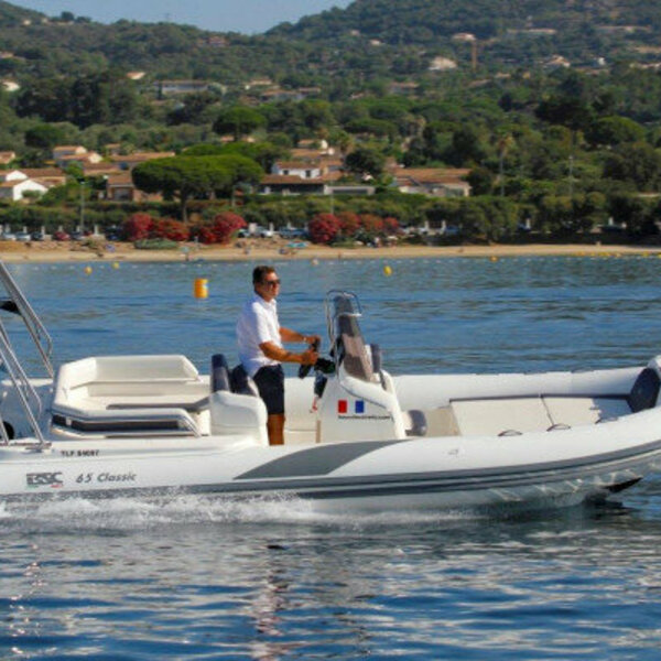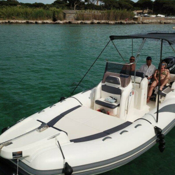Semi-rigide haut gamme et confortable. Bateau familiale spacieux, très stable au mouillage et confortable en mer. Equipements : Plateformes de bain arrière avec échelle, vaste bain de soleil avant, salon arrière en U convertible en bainde soleil, grande table, douchette, grand bimini sur rollbar, feux de navigation, assise devant console,banquette de pilotage position assise ou type leaning post, guindeau électrique, mat de ski, nombreuxcoffres de rangement. Commande moteur électrique, direction hydraulique. Options sur demande : skipper - Jouets nautique : Ski, Wake, Bouée, Sea Scooter, Masque et Tuba. Conditions de location : Complément du plein de carburant à la charge du client, réalisé par nos soins àla station des Marines de Cogolin. Caution par CB, permis de navigation et carte identité, obligatoires Forfait ménage : 150 € location de plusieurs jours ou rendu sale au retour de la journée